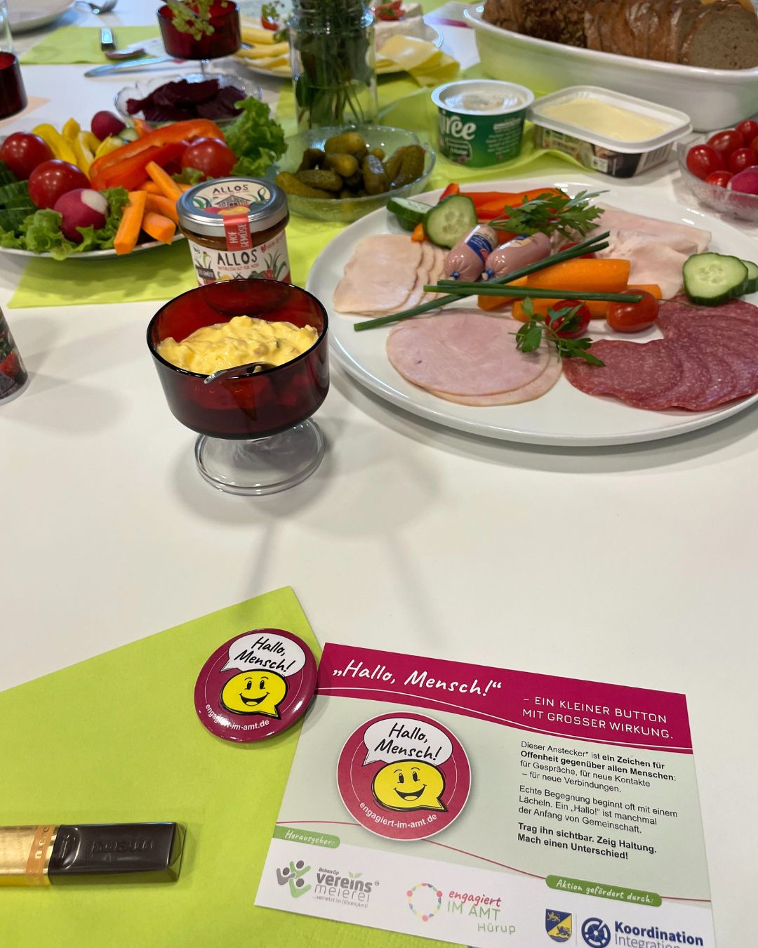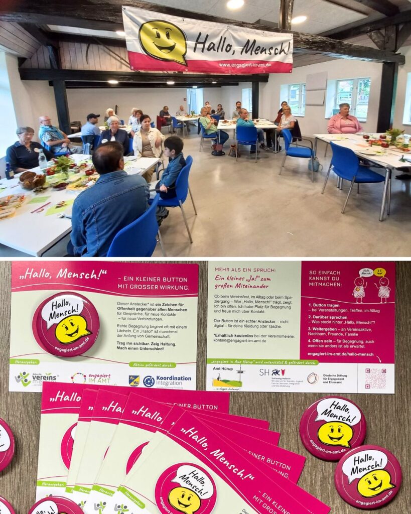 Ein echtes Herzstück des Abends war auch der kleine Button „Hallo, Mensch!“, der auf jedem Platz lag: eine fröhliche Sprechblase mit klarer Botschaft – „Ich bin offen für Begegnung“. Wer diesen Button trägt, signalisiert: Sprich mich an. Ich habe Platz für dich. Der Button wird künftig bei weiteren Veranstaltungen im Amtsgebiet verteilt und lädt dazu ein, ins Gespräch zu kommen – ob auf Festen, im Alltag oder im Verein.
