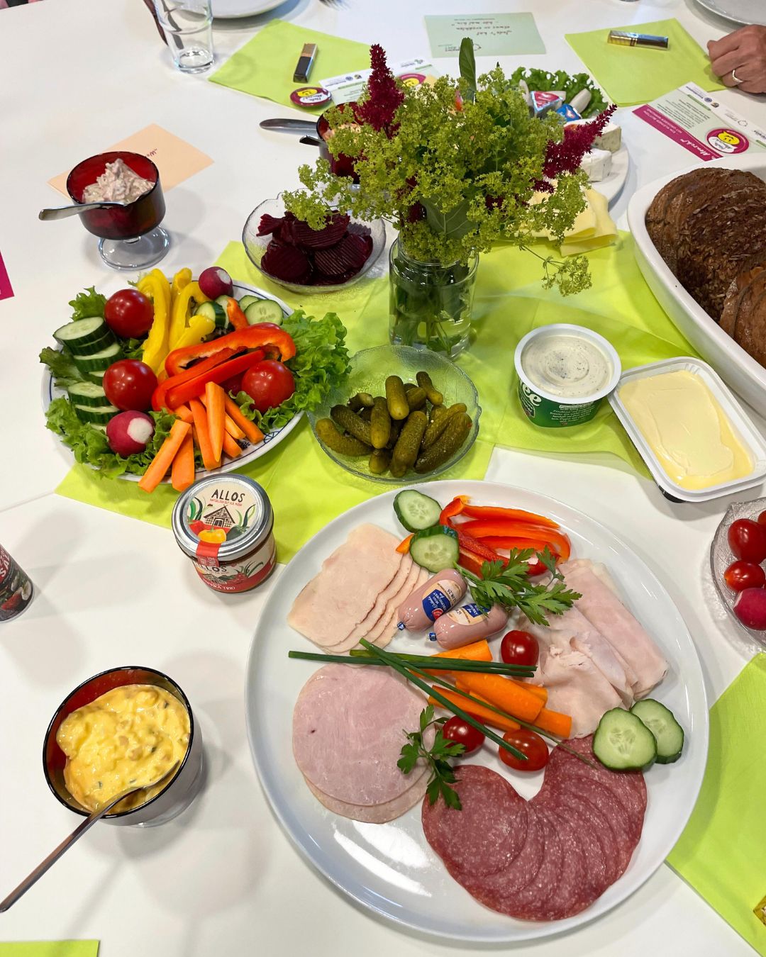 Nach einer herzlichen Begrüßung durch Anne Wollesen von der Vereinsmeierei ging es direkt an den liebevoll angerichteten Tisch. Bei kernigem Brot, Aufstrichen, Käse, Wurst, frischem Gemüse und weiteren Leckereien wurde nicht nur geschmaust, sondern auch gefragt, gelacht und zugehört. An jedem Tisch begleitete eine Person mit Erfahrung im Ehrenamt oder aus der Integrationsarbeit die Gespräche.
