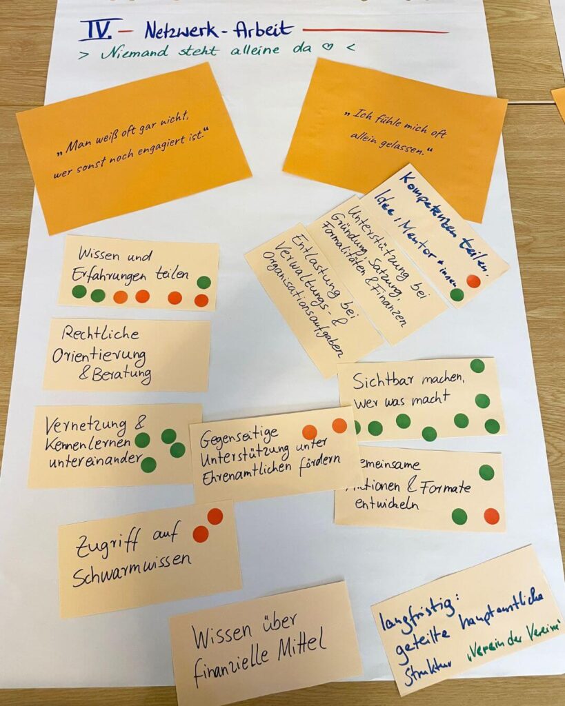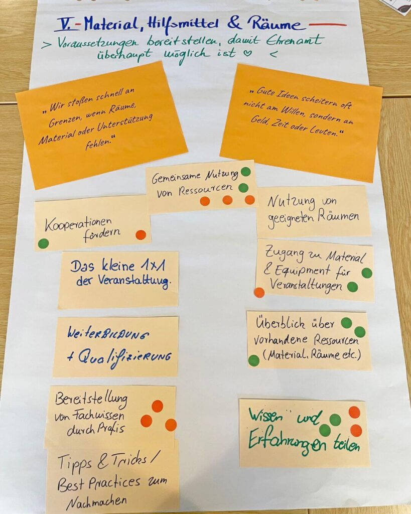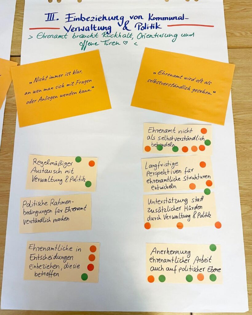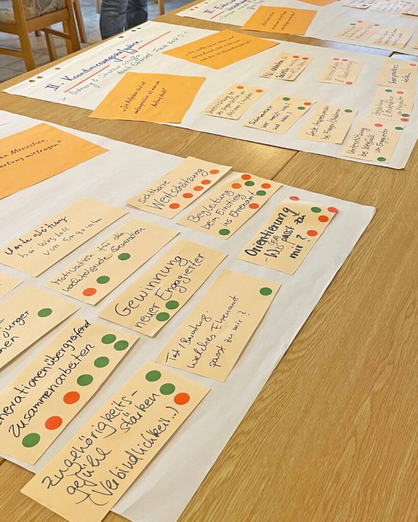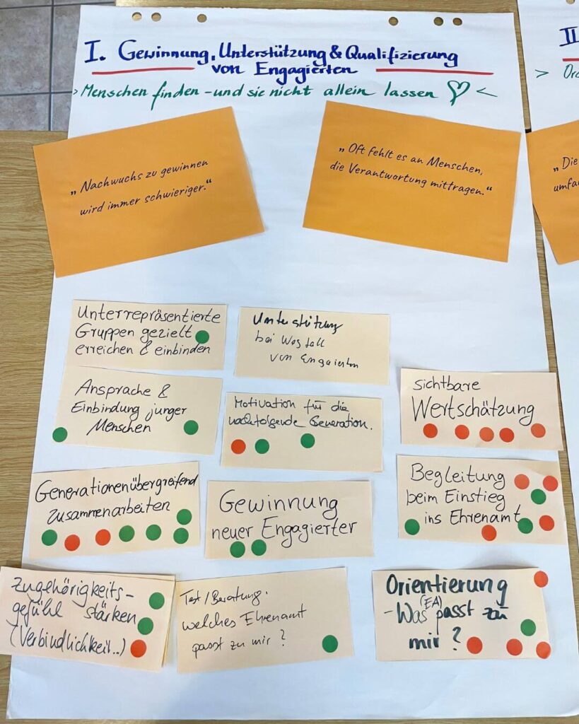 Besonders hoch priorisiert wurde der Wunsch nach langfristigen Perspektiven für ehrenamtliche Strukturen. Viele rote Punkte entfielen außerdem auf alles, was mit Orientierung und Einstieg zu tun hat – von persönlicher Begleitung über Beratung bis hin zur Frage: Welches Ehrenamt passt eigentlich zu mir?