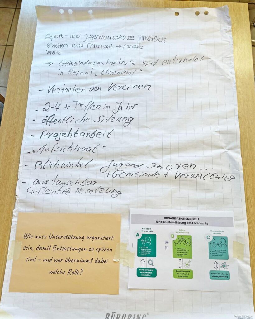 Im Mittelpunkt stand die Frage, wie Unterstützung für Ehrenamt organisiert sein muss, damit sie tatsächlich entlastet – und welche Rollen dafür notwendig sind. Diskutiert wurde sehr konkret, wie politische Gremien, Verwaltung und Ehrenamt künftig zusammenwirken können.