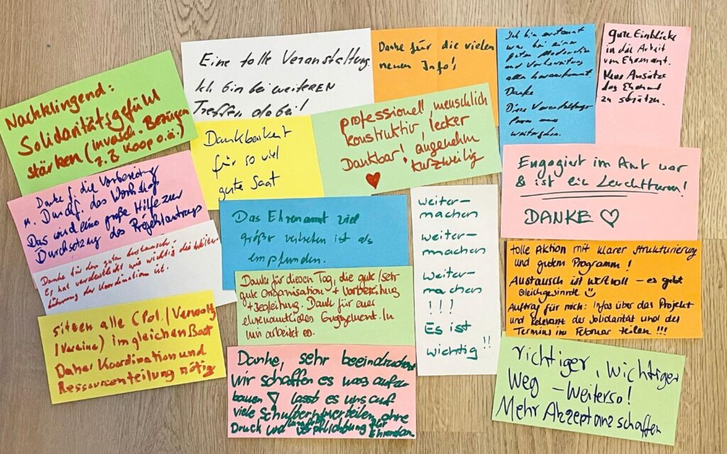 Die Abschlusskärtchen spiegeln die Stimmung des Tages sehr deutlich wider: Dankbarkeit, Aufbruch, Solidarität und der Wunsch, weiterzumachen. Viele Teilnehmende betonten, wie wertvoll der Austausch war und wie viel Klarheit durch die gute Struktur und Moderation entstanden ist.